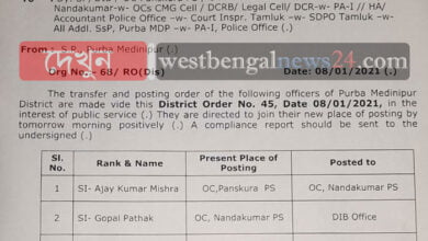 জানুয়ারি ১০, ২০২১আবারো পূর্ব মেদিনীপুরে পুলিশ প্রশাসনে রদবদল